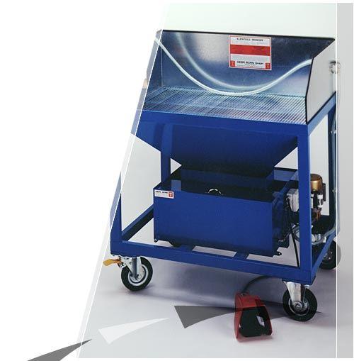 In ergonomisch angepasster Arbeitshöhe werden die verschmutzen Teile abgelegt und mühelos gereinigt. Der dazu benötigte Durchlauf-Pinsel befindet sich direkt an der Schlauchleitung, durch die das Reinigungsmittel über einen Sicherheits-Fußschalter und einen Regulierhebel exakt zu dosieren ist.